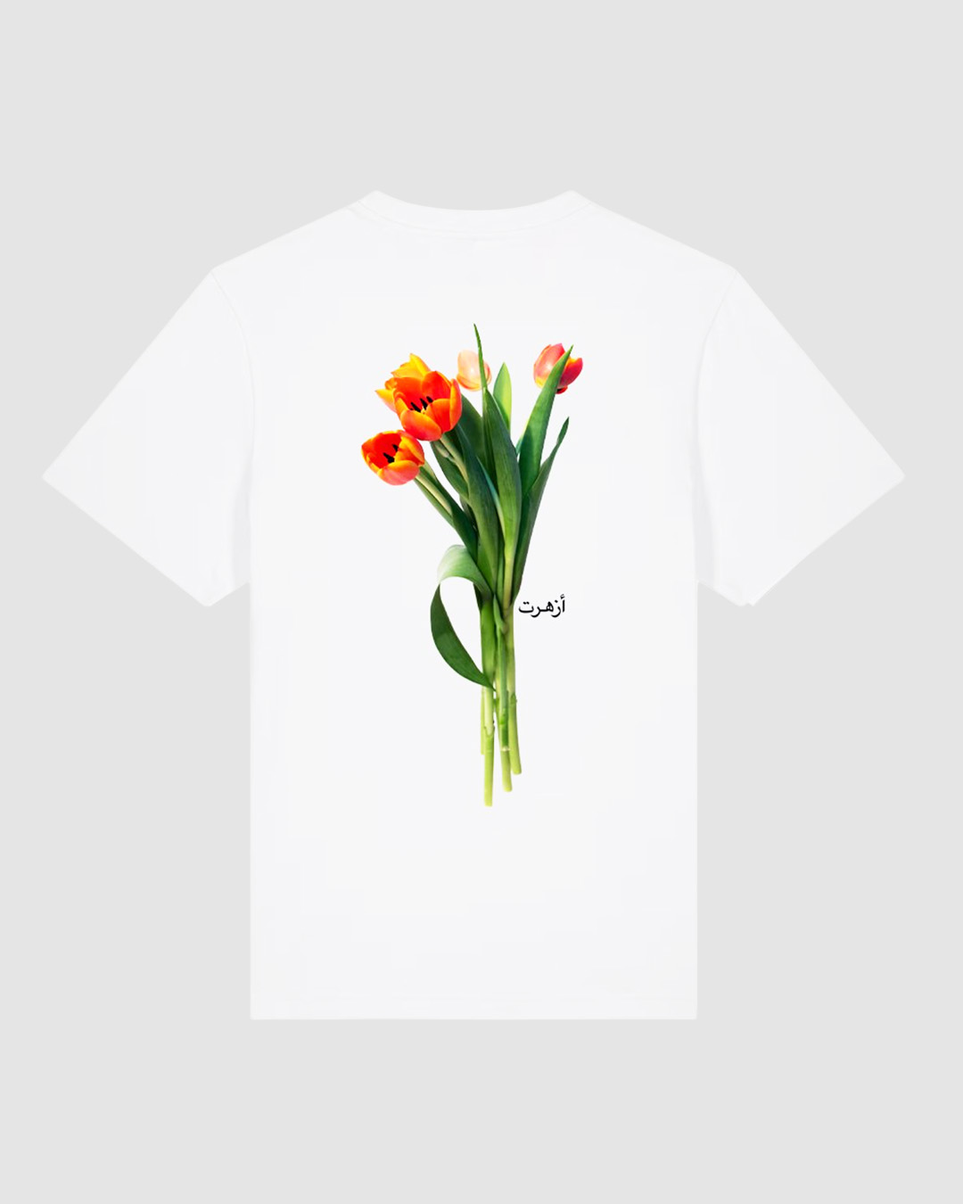 Habibi Bloom 2.0 T-Shirt. Backprint “أزهرت”, bedeutet “aufgeblüht” und wird “Azharat” ausgesprochen. Frontprint “ورد”, bedeutet “Blume” und wird “Wared” ausgesprochen. Auf der linken Brust ist das Habibi Logo in Schwarz bestickt.