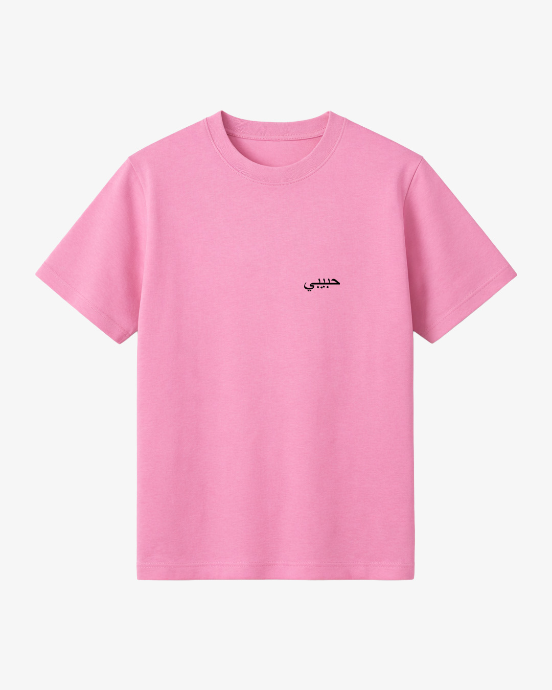 Das neue Habibi Light+ T-Shirt in der Farbe Bubble Pink. Schwarzer Habibi Stick. Das T-Shirt ist oversized, weich und unisex.