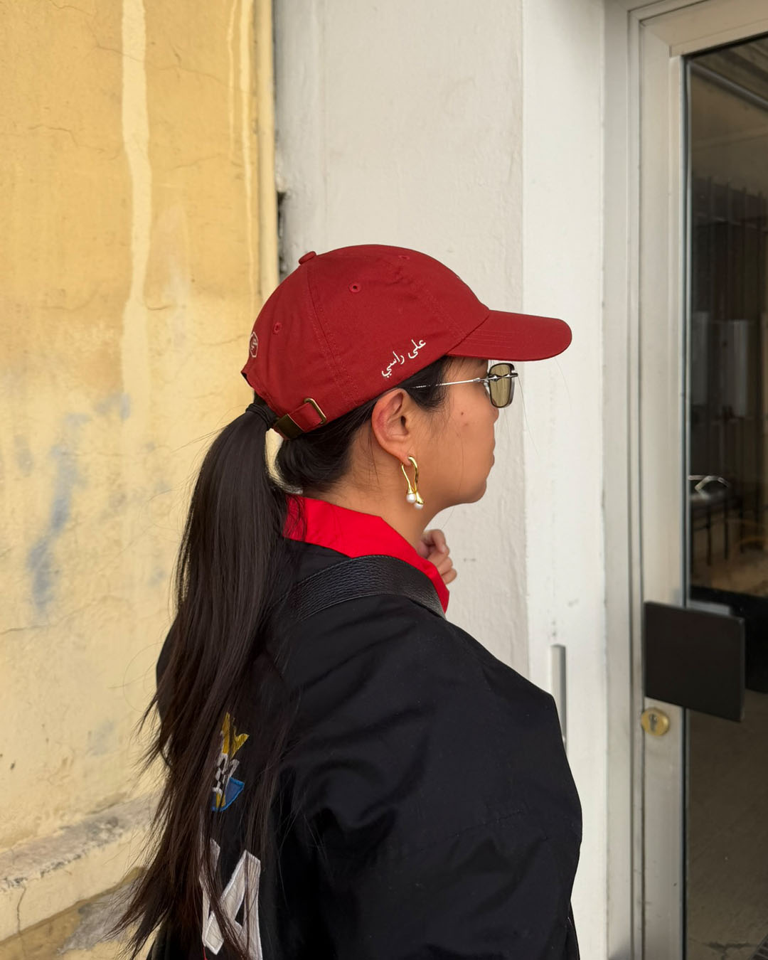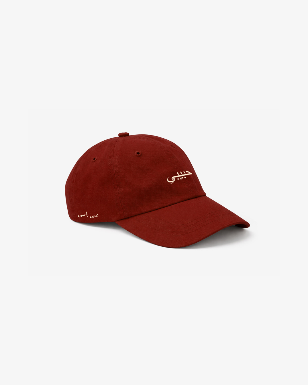 Auf der Cap steht auf der Seite „على راسي“ – wörtlich: „auf meinem Kopf“. Sinngemäß heißt das: „Natürlich, sehr gern.” Aussprache Deutsch: „ala raasi“. Vorne und hinten ist das Habibi Logo bestickt.