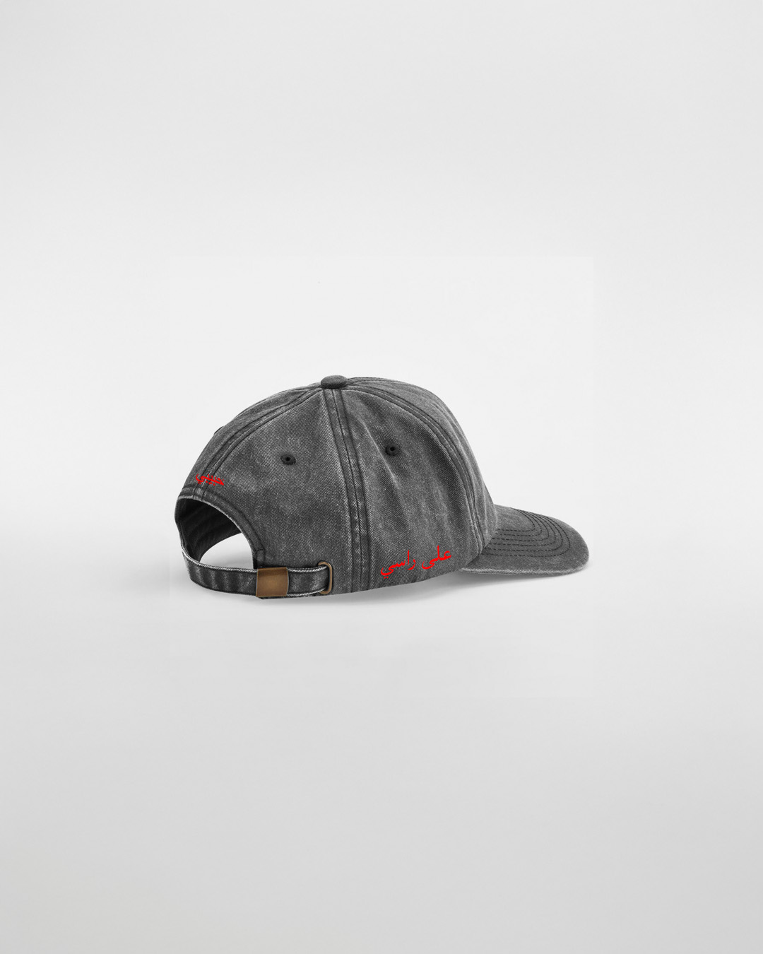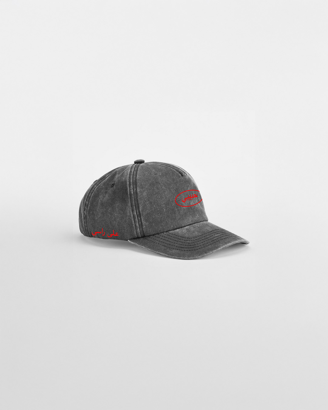 Auf der Cap steht auf der Seite „على راسي“ – wörtlich: „auf meinem Kopf“. Sinngemäß heißt das: „Natürlich, sehr gern.” Aussprache Deutsch: „ala raasi“. Vorne und hinten ist das Habibi Logo bestickt.
