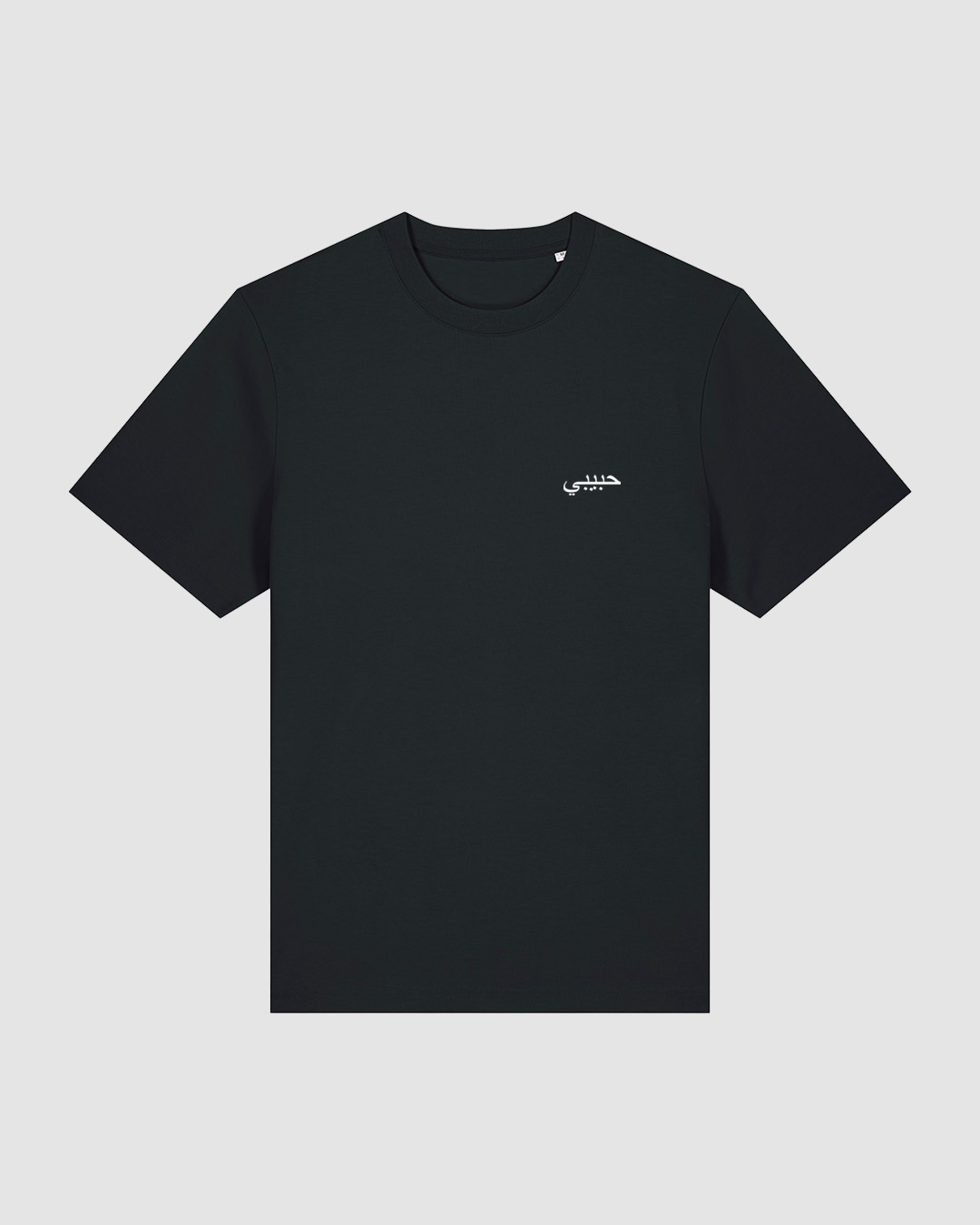Das neue Habibi Light+ T-Shirt in der Farbe Schwarz mit einem gestickten Weiß. Das T-Shirt besteht aus 100% organischer Premium Baumwolle und sitzt oversized. Unisex. Im Gegensatz zu unserem Classic T-Shirt hat das Light+ T-Shirt eine softere Haptik und ist im Gewicht minimal leichter.