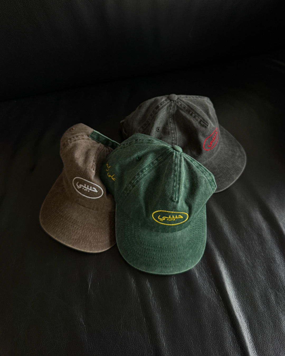 Auf der Cap steht auf der Seite „على راسي“ – wörtlich: „auf meinem Kopf“. Sinngemäß heißt das: „Natürlich, sehr gern.” Aussprache Deutsch: „ala raasi“. Vorne und hinten ist das Habibi Logo bestickt.